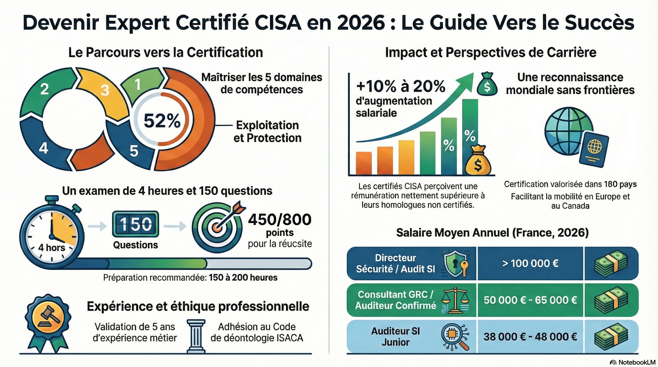 💰 Impact de la certification : Les professionnels certifiés CISA gagnent en moyenne 10 à 20 % de plus que leurs homologues non certifiés à poste équivalent, selon les études salariales de l'ISACA.